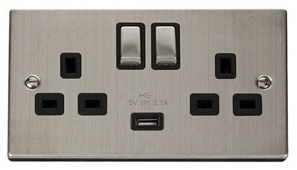 Stainless Steel 2 Gang 13A DP Ingot 1 USB Twin Double Switched Plug Socket - Black Trim