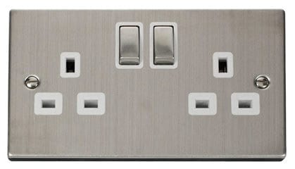 Stainless Steel 2 Gang 13A DP Ingot Twin Double Switched Plug Socket - White Trim